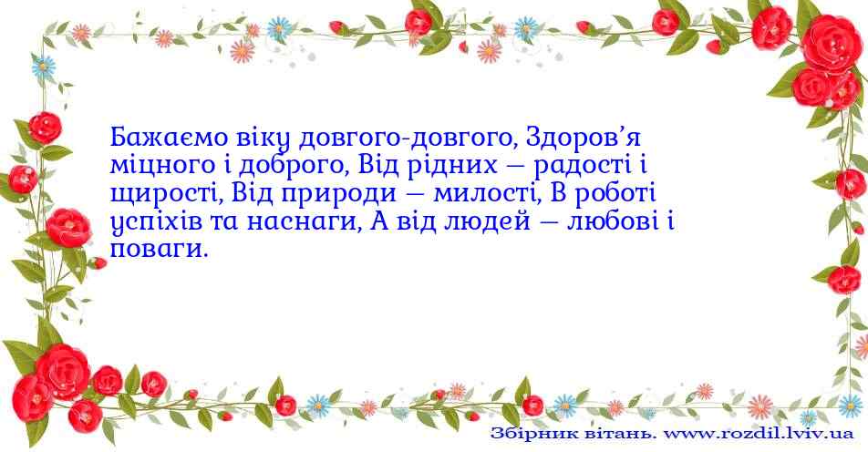 Бажаємо віку довгого довгого, Здоров’я міцного і доброго, Від рідних –...
