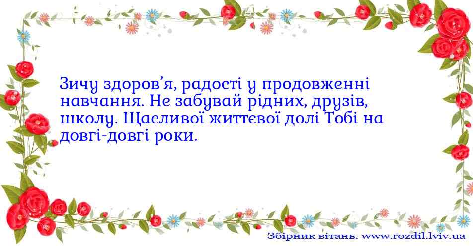 Зичу здоров’я, радості у продовженні навчання. Не забувай рідних, друзів, школу.Щасливої життєвої долі Тобі на довгі-довгі роки.