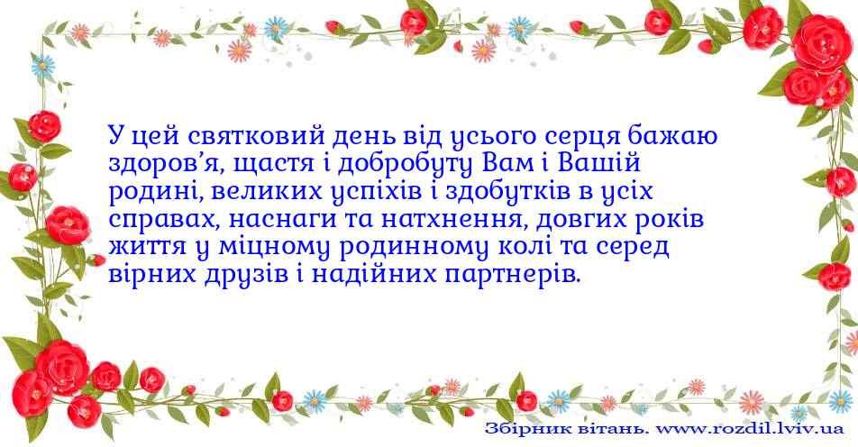 У цей святковий день від усього серця бажаю здоров’я, щастя і добробуту Вам і Вашій родині, великих успіхів і здобутків в усіх справах, наснаги та натхнення, довгих років життя у міцному родинному колі та серед вірних друзів і надійних партнерів.вітання №138