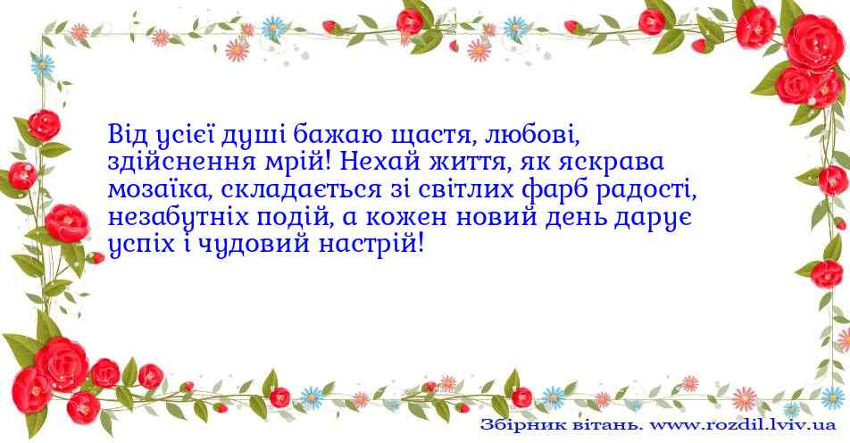 Від усієї душі бажаю щастя, любові, здійснення мрій!Нехай життя, як яскрава мозаїка, складається зі світлих фарб радості, незабутніх подій, а кожен новий день дарує успіх і чудовий настрій!