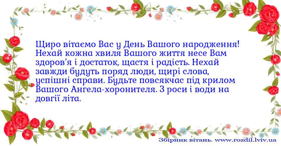 Щиро вітаємо Вас у День Вашого народження!Нехай кожна хвиля Вашого життя несе Вам здоров’я і достаток, щастя і радість. Нехай завжди будуть поряд люди, щирі слова, успішні справи. Будьте повсякчас під крилом Вашого Ангела-хоронителя. З роси і води на довгії літа.