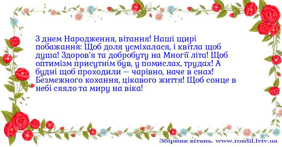З днем Народження, вітання! Наші щирі побажання:Щоб доля усміхалася, і квітла щоб душа!