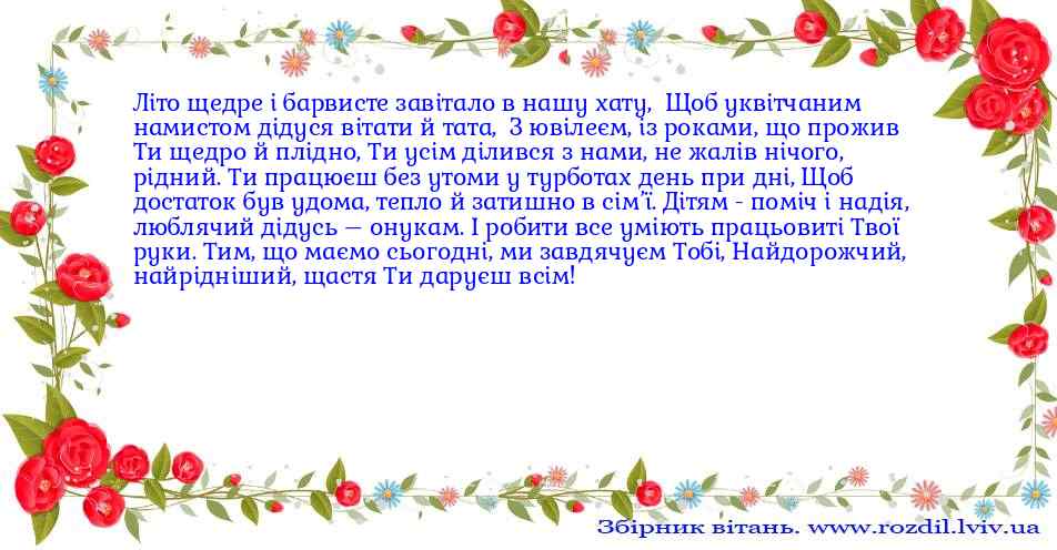 Літо щедре і барвисте завітало в нашу хату, Щоб уквітчаним намистом дідуся вітати й тата,