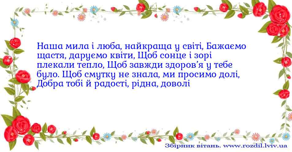 Наша мила і люба, найкраща у світі,Бажаємо щастя, даруємо квіти,