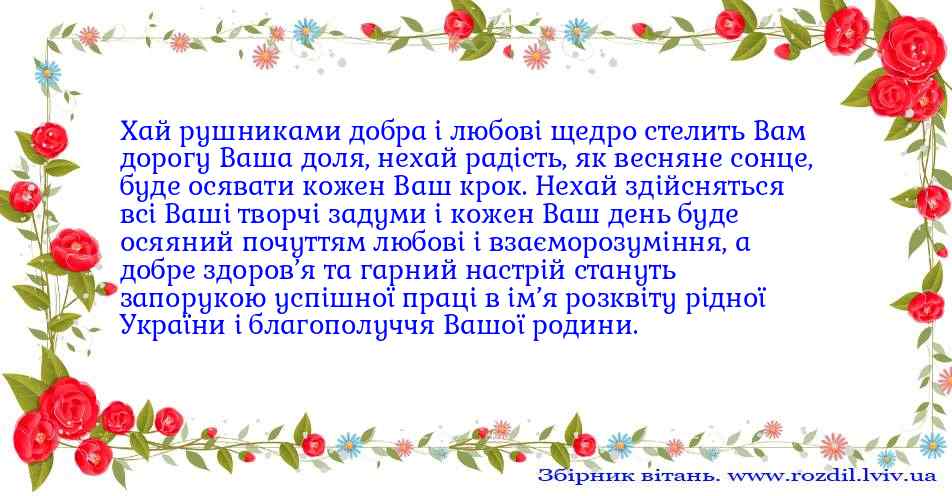 буде осявати кожен Ваш крок. Нехай здійсняться всі Ваші творчі задуми і кожен Ваш день буде осяяний почуттям любові і взаєморозуміння, а добре здоров’я та гарний настрій стануть запорукою успішної праці в ім’я розквіту рідної України і благополуччя Вашої родини. вітання №401