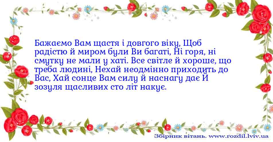 Бажаємо Вам щастя і довгого віку,Щоб радістю й миром були Ви багаті,