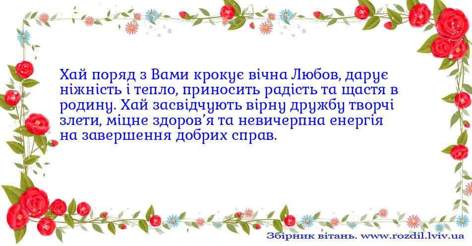 Хай поряд з Вами крокує вічна Любов, дарує ніжність і тепло, приносить радість та щастя в родину. Хай засвідчують вірну дружбу творчі злети, міцне здоров’я та невичерпна енергія на завершення добрих справ.вітання №436