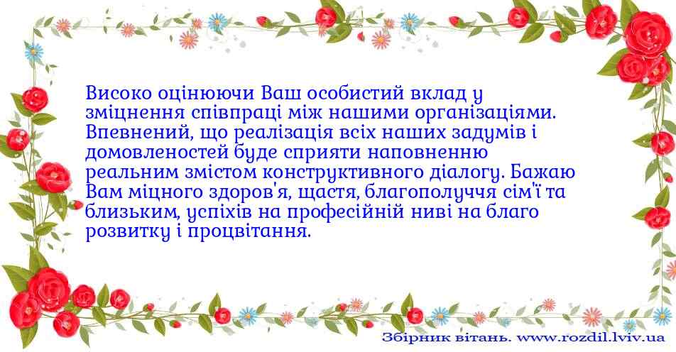 Високо оцінюючи Ваш особистий вклад у зміцнення співпраці між нашими організаціями. Впевнений, що реалізація всіх наших задумів і домовленостей буде сприяти наповненню реальним змістом конструктивного діалогу. Бажаю Вам міцного здоров'я, щастя, благополуччя сім'ї та близьким, успіхів на професійній ниві на благо розвитку і процвітання.вітання №503