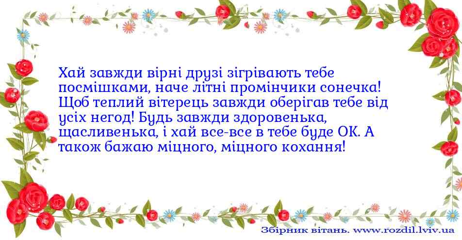 Хай завжди вірні друзі зігрівають тебе посмішками, наче літні промінчики сонечка! Щоб теплий вітерець завжди оберігав тебе від усіх негод! Будь завжди здоровенька, щасливенька, і хай все-все в тебе буде OK. А також бажаю міцного, міцного кохання!вітання №533