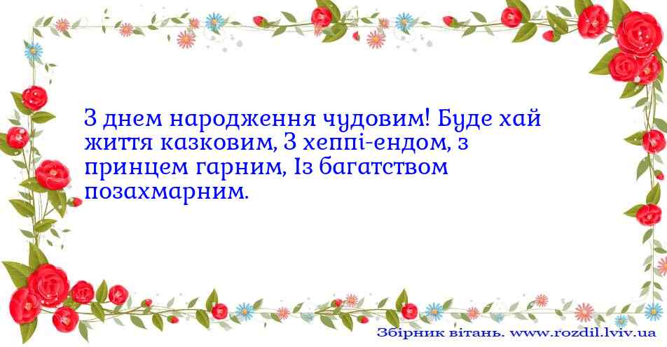 З днем народження чудовим! Буде хай життя казковим, З хеппі ендом...