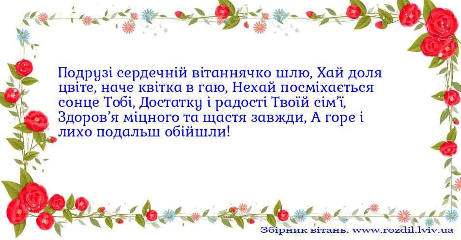 Подрузі сердечній вітаннячко шлю,Хай доля цвіте, наче квітка в гаю,