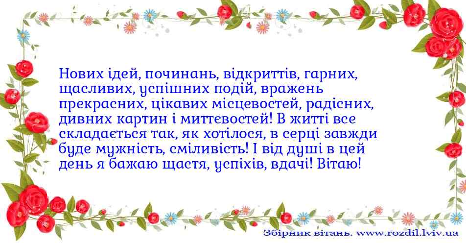 Нових ідей, починань, відкриттів, гарних, щасливих, успішних подій, вражень прекрасних, цікавих місцевостей, радісних, дивних картин і миттєвостей! В житті все складається так, як хотілося, в серці завжди буде мужність, сміливість! І від душі в цей день я бажаю щастя, успіхів, вдачі! Вітаю!вітання №598