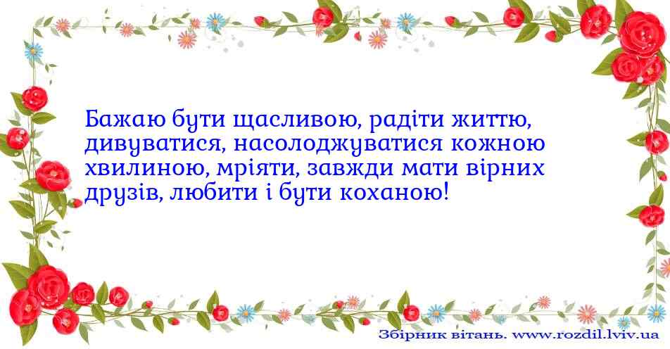 Бажаю бути щасливою, радіти життю, дивуватися, насолоджуватися кожною хвилиною, мріяти, завжди мати вірних друзів, любити і бути коханою!вітання №605