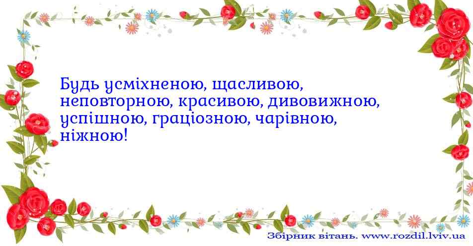 Будь усміхненою, щасливою, неповторною, красивою, дивовижною, успішною, граціозною, чарівною, ніжною!вітання №619