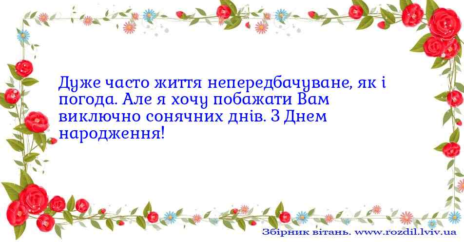 Дуже часто життя непередбачуване, як і погода. Але я хочу побажати Вам виключно сонячних днів. З Днем народження!вітання №622