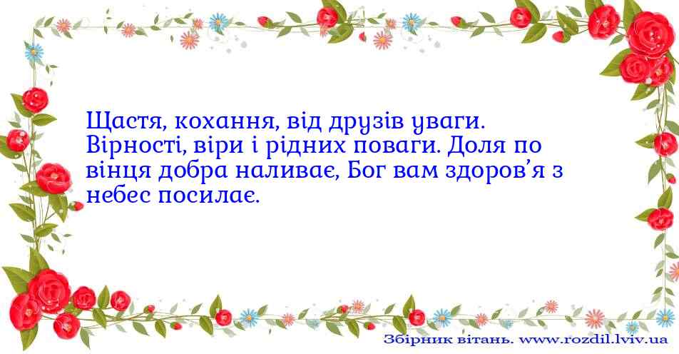 Щастя, кохання, від друзів уваги. Вірності, віри і рідних поваги. Доля по вінця добра наливає, Бог вам здоров’я з небес посилає.вітання №625
