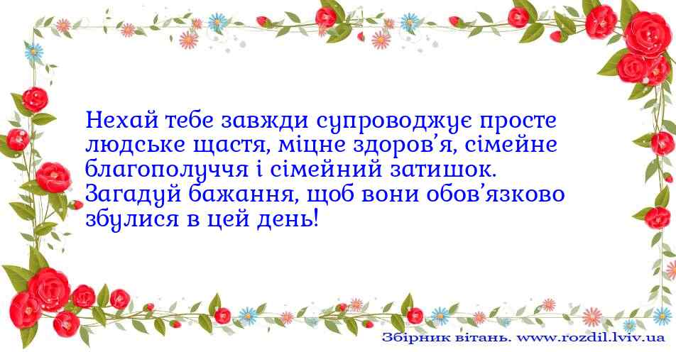 Нехай тебе завжди супроводжує просте людське щастя, міцне здоров’я, сімейне благополуччя і сімейний затишок. Загадуй бажання, щоб вони обов’язково збулися в цей день!вітання №679