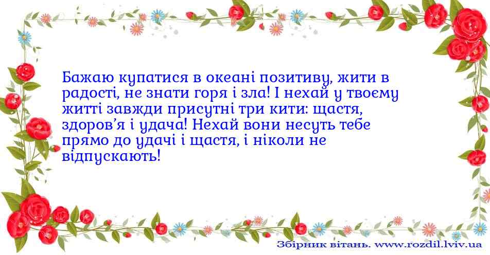 Бажаю купатися в океані позитиву, жити в радості, не знати горя і зла! І нехай у твоєму житті завжди присутні три кити: щастя, здоров’я і удача! Нехай вони несуть тебе прямо до удачі і щастя, і ніколи не відпускають!вітання №694