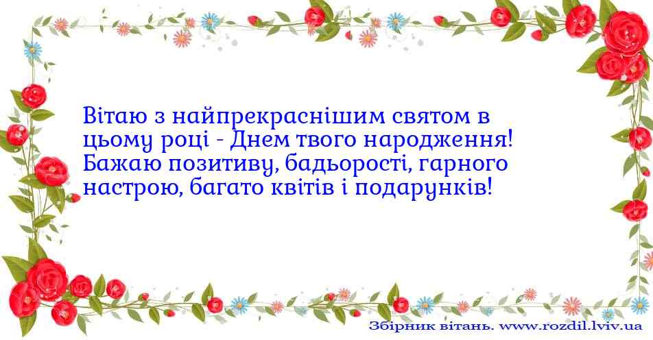 Вітаю з найпрекраснішим святом в цьому році - Днем твого народження! Бажаю позитиву, бадьорості, гарного настрою, багато квітів і подарунків!вітання №700