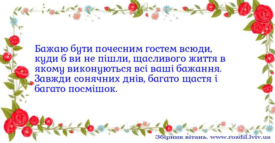 Бажаю бути почесним гостем всюди, куди б ви не пішли, щасливого життя в якому виконуються всі ваші бажання. Завжди сонячних днів, багато щастя і багато посмішок.вітання №702