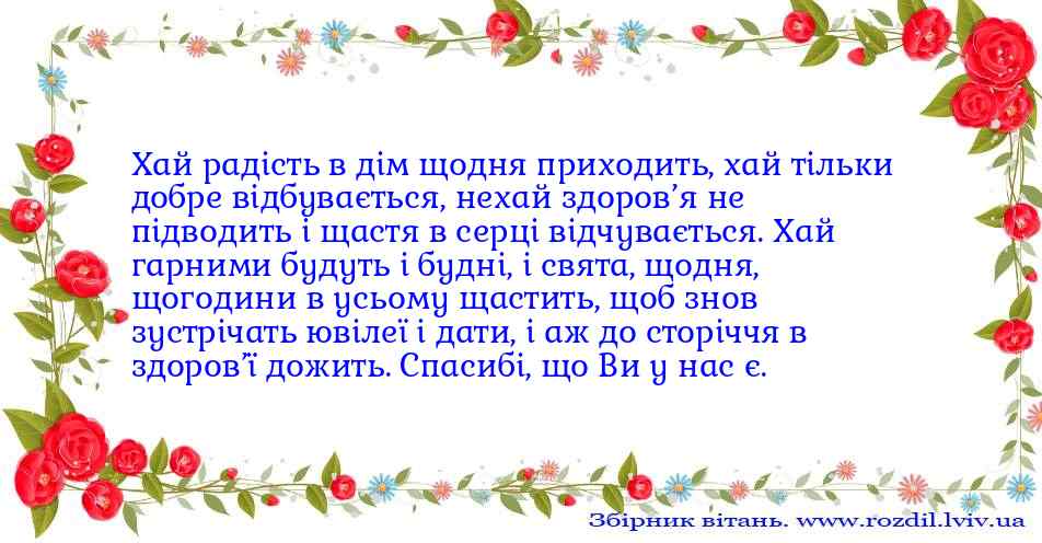 Хай радість в дім щодня приходить, хай тільки добре відбувається, нехай здоров’я не підводить і щастя в серці відчувається. Хай гарними будуть і будні, і свята, щодня, щогодини в усьому щастить, щоб знов зустрічать ювілеї і дати, і аж до сторіччя в здоров’ї дожить. Спасибі, що Ви у нас є.вітання №714