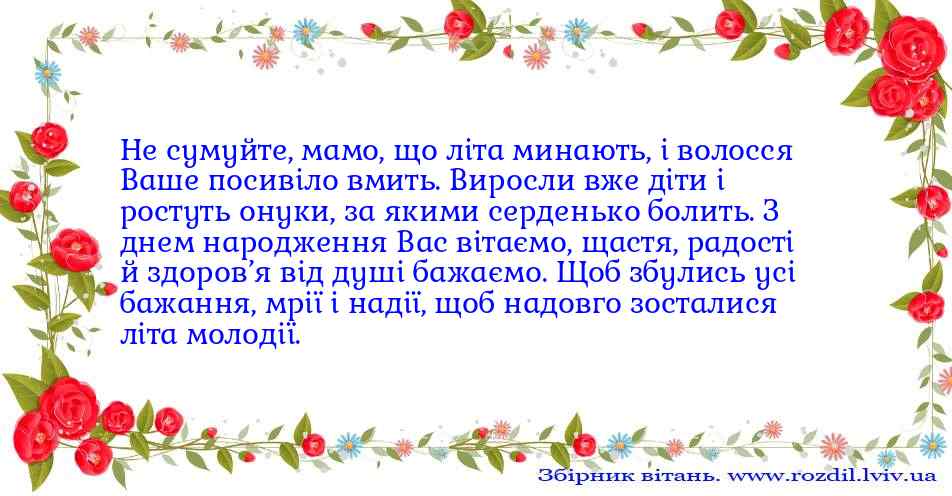 Не сумуйте, мамо, що літа минають, і волосся Ваше посивіло вмить. Виросли вже діти і ростуть онуки, за якими серденько болить. З днем народження Вас вітаємо, щастя, радості й здоров’я від душі бажаємо. Щоб збулись усі бажання, мрії і надії, щоб надовго зосталися літа молодії.вітання №719