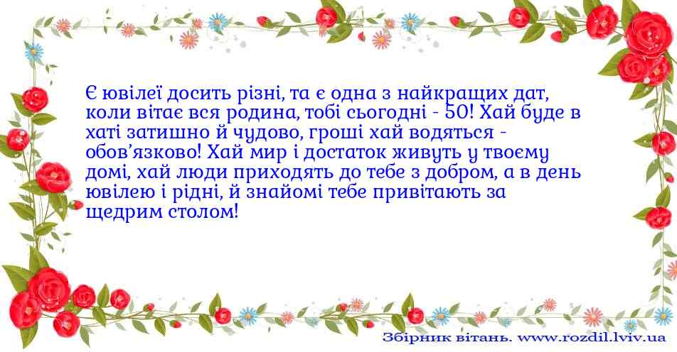 Є ювілеї досить різні, та є одна з найкращих дат, коли вітає вся родина, тобі сьогодні - 50! Хай буде в хаті затишно й чудово, гроші хай водяться - обов’язково! Хай мир і достаток живуть у твоєму домі, хай люди приходять до тебе з добром, а в день ювілею і рідні, й знайомі тебе привітають за щедрим столом!вітання №725