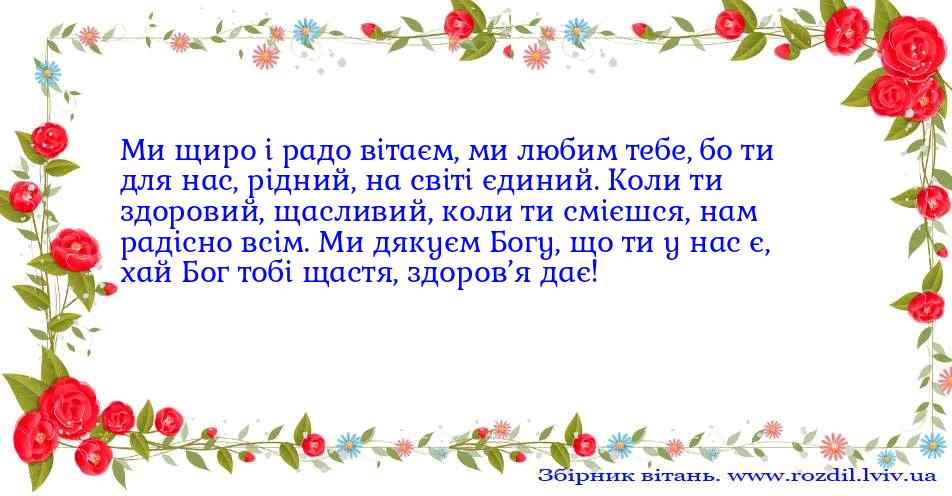 Ми щиро і радо вітаєм, ми любим тебе, бо ти для нас, рідний, на світі єдиний. Коли ти здоровий, щасливий, коли ти смієшся, нам радісно всім. Ми дякуєм Богу, що ти у нас є, хай Бог тобі щастя, здоров’я дає!вітання №732