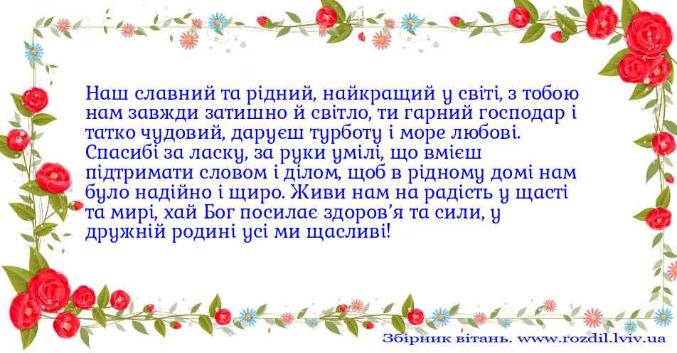 Наш славний та рідний, найкращий у світі, з тобою нам завжди затишно й світло, ти гарний господар і татко чудовий, даруєш турботу і море любові. Спасибі за ласку, за руки умілі, що вмієш підтримати словом і ділом, щоб в рідному домі нам було надійно і щиро. Живи нам на радість у щасті та мирі, хай Бог посилає здоров’я та сили, у дружній родині усі ми щасливі!вітання №733