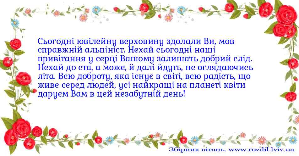 Сьогодні ювілейну верховину здолали Ви, мов справжній альпініст. Нехай сьогодні наші привітання у серці Вашому залишать добрий слід. Нехай до ста, а може, й далі йдуть, не оглядаючись літа. Всю доброту, яка існує в світі, всю радість, що живе серед людей, усі найкращі на планеті квіти даруєм Вам в цей незабутній день!вітання №734