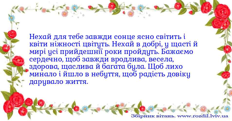 Нехай для тебе завжди сонце ясно світить і квіти ніжності цвітуть. Нехай в добрі, у щасті й мирі усі прийдешнії роки пройдуть. Бажаємо сердечно, щоб завжди вродлива, весела, здорова, щаслива й багата була. Щоб лихо минало і йшло в небуття, щоб радість довіку дарувало життя.вітання №736