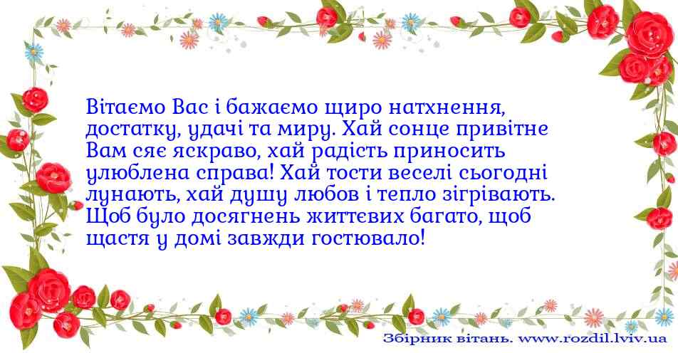 Вітаємо Вас і бажаємо щиро натхнення, достатку, удачі та миру. Хай сонце привітне Вам сяє яскраво, хай радість приносить улюблена справа! Хай тости веселі сьогодні лунають, хай душу любов і тепло зігрівають. Щоб було досягнень життєвих багато, щоб щастя у домі завжди гостювало!вітання №745