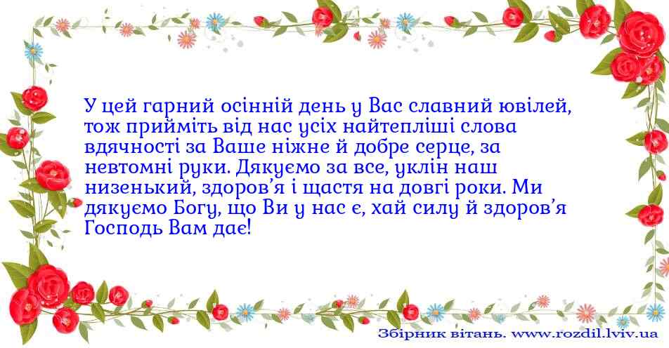 У цей гарний осінній день у Вас славний ювілей, тож прийміть від нас усіх найтепліші слова вдячності за Ваше ніжне й добре серце, за невтомні руки. Дякуємо за все, уклін наш низенький, здоров’я і щастя на довгі роки. Ми дякуємо Богу, що Ви у нас є, хай силу й здоров’я Господь Вам дає!вітання №770