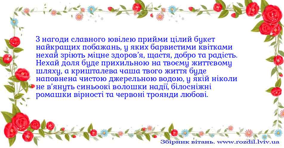 З нагоди славного ювілею прийми цілий букет найкращих побажань, у яких барвистими квітками нехай зріють міцне здоров’я, щастя, добро та радість. Нехай доля буде прихильною на твоєму життєвому шляху, а кришталева чаша твого життя буде наповнена чистою джерельною водою, у якій ніколи не в’януть синьоокі волошки надії, білосніжні ромашки вірності та червоні троянди любові.вітання №786