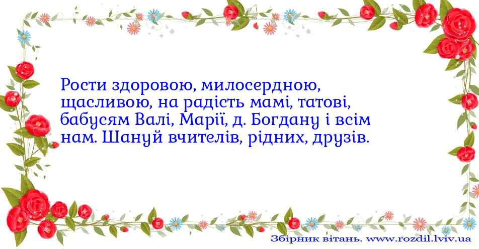 Рости здоровою, милосердною, щасливою, на радість мамі,татові, бабусям Валі, Марії, д. Богдану і всім нам. Шануй вчителів, рідних, друзів.