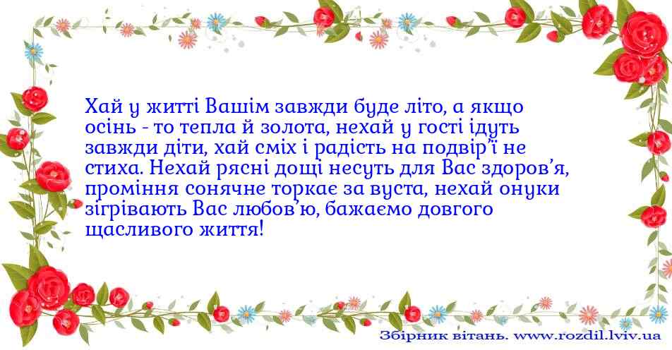 Хай у житті Вашім завжди буде літо, а якщо осінь - то тепла й золота, нехай у гості ідуть завжди діти, хай сміх і радість на подвір’ї не стиха. Нехай рясні дощі несуть для Вас здоров’я, проміння сонячне торкає за вуста, нехай онуки зігрівають Вас любов’ю, бажаємо довгого щасливого життя!вітання №835