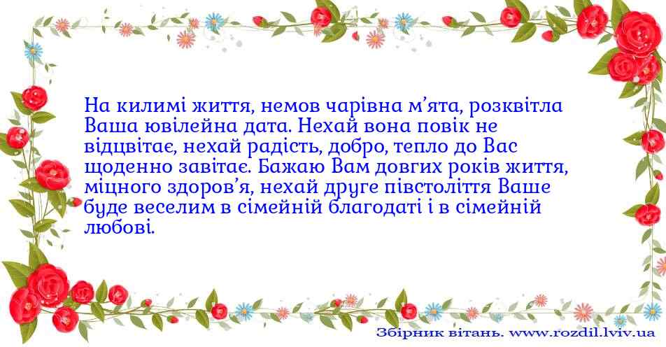 На килимі життя, немов чарівна м’ята, розквітла Ваша ювілейна дата. Нехай вона повік не відцвітає, нехай радість, добро, тепло до Вас щоденно завітає. Бажаю Вам довгих років життя, міцного здоров’я, нехай друге півстоліття Ваше буде веселим в сімейній благодаті і в сімейній любові.вітання №850