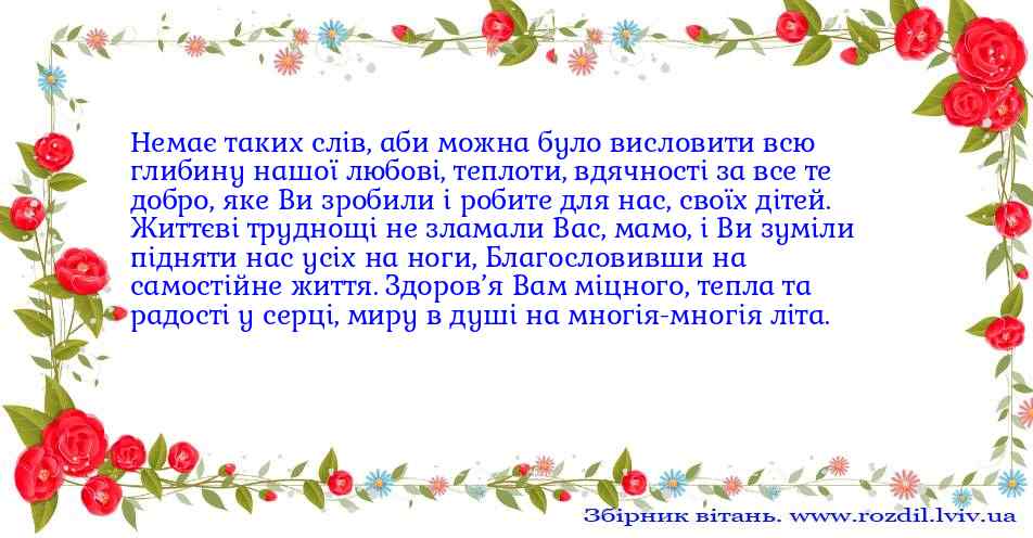 Немає таких слів, аби можна було висловити всю глибину нашої любові, теплоти, вдячності за все те добро, яке Ви зробили і робите для нас, своїх дітей. Життєві труднощі не зламали Вас, мамо, і Ви зуміли підняти нас усіх на ноги, Благословивши на самостійне життя. Здоров’я Вам міцного, тепла та радості у серці, миру в душі на многія-многія літа.вітання №852