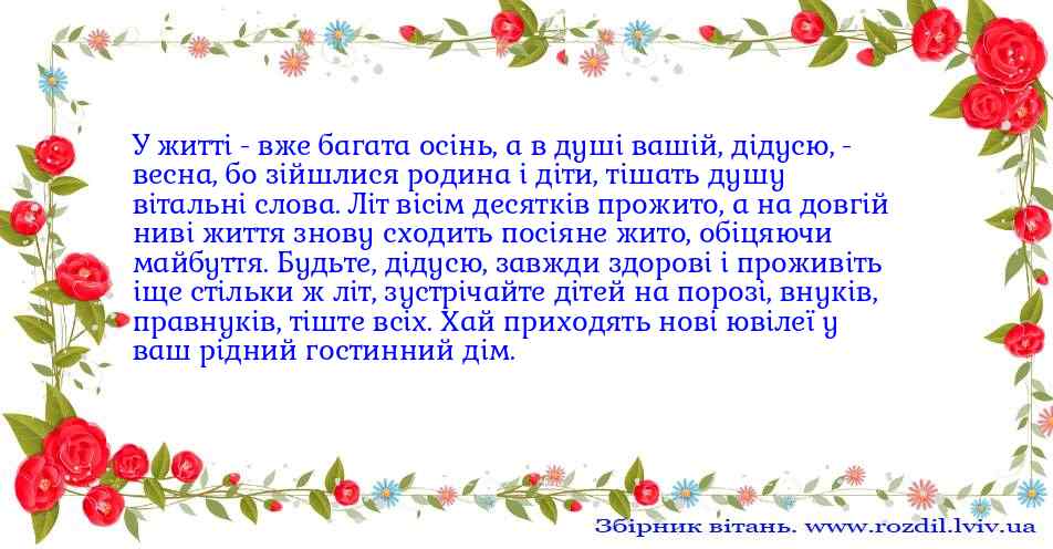 У житті - вже багата осінь, а в душі вашій, дідусю, - весна, бо зійшлися родина і діти, тішать душу вітальні слова. Літ вісім десятків прожито, а на довгій ниві життя знову сходить посіяне жито, обіцяючи майбуття. Будьте, дідусю, завжди здорові і проживіть іще стільки ж літ, зустрічайте дітей на порозі, внуків, правнуків, тіште всіх. Хай приходять нові ювілеї у ваш рідний гостинний дім.вітання №854