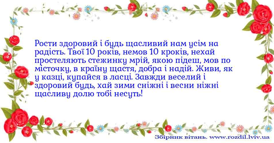 Рости здоровий і будь щасливий нам усім на радість. Твої 10 років, немов 10 кроків, нехай простеляють стежинку мрій, якою підеш, мов по місточку, в країну щастя, добра і надій. Живи, як у казці, купайся в ласці. Завжди веселий і здоровий будь, хай зими сніжні і весни ніжні щасливу долю тобі несуть!вітання №892