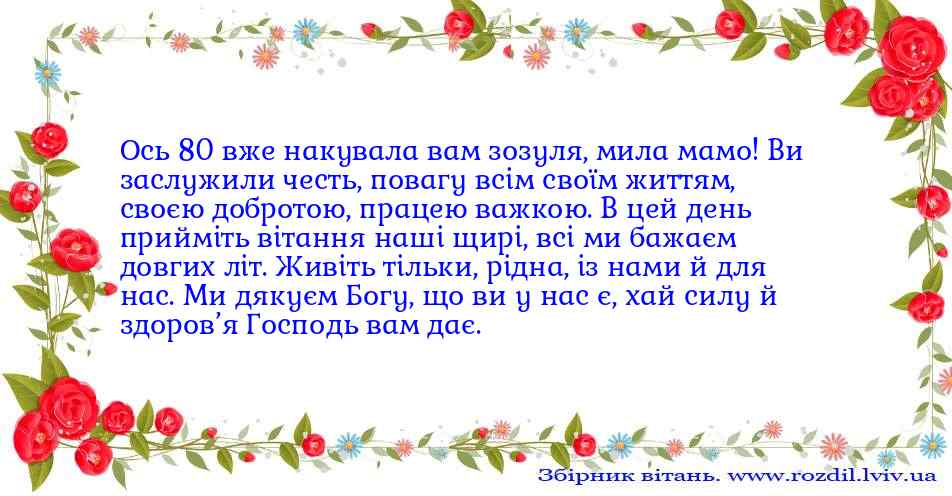 Ось 80 вже накувала вам зозуля, мила мамо! Ви заслужили честь, повагу всім своїм життям, своєю добротою, працею важкою. В цей день прийміть вітання наші щирі, всі ми бажаєм довгих літ. Живіть тільки, рідна, із нами й для нас. Ми дякуєм Богу, що ви у нас є, хай силу й здоров’я Господь вам дає.вітання №901
