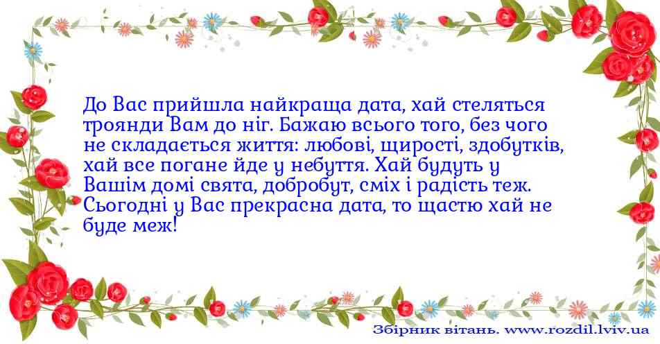 До Вас прийшла найкраща дата, хай стеляться троянди Вам до ніг. Бажаю всього того, без чого не складається життя: любові, щирості, здобутків, хай все погане йде у небуття. Хай будуть у Вашім домі свята, добробут, сміх і радість теж. Сьогодні у Вас прекрасна дата, то щастю хай не буде меж!вітання №903
