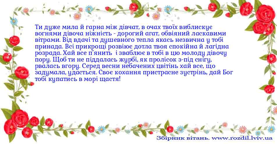 Ти дуже мила й гарна між дівчат, в очах твоїх виблискує вогнями дівоча ніжність - дорогий агат, обвіяний ласкавими вітрами. Від вдачі та душевного тепла якась незвична у тобі принада. Всі прикрощі розвіює дотла твоя спокійна й лагідна розрада. Хай все п’янить і зваблює в тобі в цю молоду дівочу пору. Щоб ти не піддалась журбі, як пролісок з-під снігу, рвалась вгору. Серед весни небачених цвітінь хай все, що задумала, удасться. Своє кохання пристрасне зустрінь, дай Бог тобі купатись в морі щастя!вітання №920
