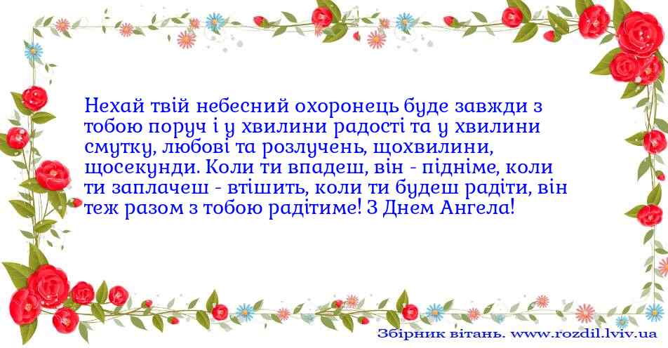 Нехай твій небесний охоронець буде завжди з тобою поруч і у хвилини радості та у хвилини смутку, любові та розлучень, щохвилини, щосекунди. Коли ти впадеш, він - підніме, коли ти заплачеш - втішить, коли ти будеш радіти, він теж разом з тобою радітиме! З Днем Ангела!вітання №932