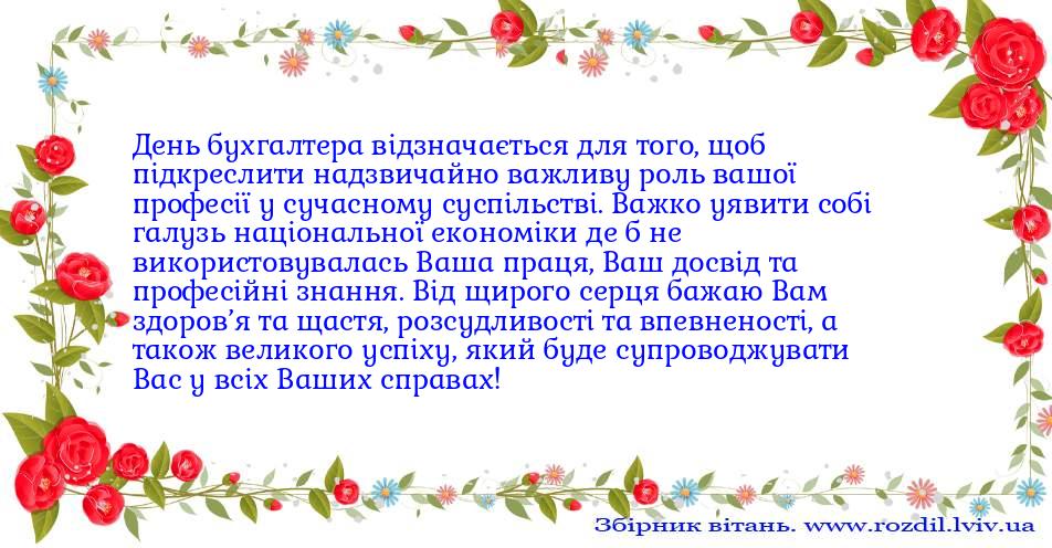 День бухгалтера відзначається для того, щоб підкреслити надзвичайно важливу роль вашої професії у сучасному суспільстві. Важко уявити собі галузь національної економіки де б не використовувалась Ваша праця, Ваш досвід та професійні знання. Від щирого серця бажаю Вам здоров’я та щастя, розсудливості та впевненості, а також великого успіху, який буде супроводжувати Вас у всіх Ваших справах!